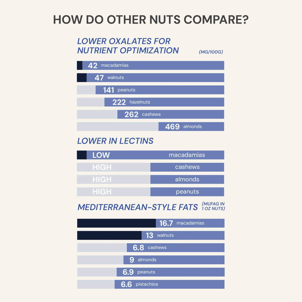 Each serving contains 2g monounsaturated fat, the rare omega-7 fatty acid, and 200mg polyphenols, equivalent to ½ cup of fresh blueberries. Macadamias and walnuts offer Mediterranean-style fats and low lectin content for optimal nutrient absorption, while the wild blueberries deliver powerful antioxidant support.