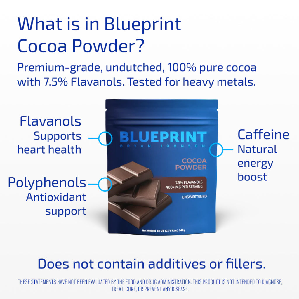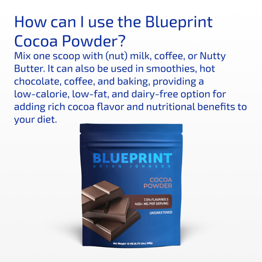 Discover the ultimate indulgence with Blueprint Cocoa Powder by Bryan Johnson, the most measured person in history and a professional rejuvenation athlete. Designed to support optimal health and wellness, this premium cocoa powder delivers uncompromising quality and taste.